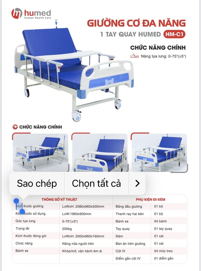 Bên cạnh đó, giường 1 tay quay Humed HM-C1 cũng là lựa chọn đáng tham khảo với những khách hàng muốn tối ưu chi phí nhưng vẫn đảm bảo nhu cầu chăm sóc cơ bản. Dòng sản phẩm này phù hợp với người cần nâng lưng khi nằm nghỉ, phục hồi sau điều trị hoặc sử dụng trong môi trường chăm sóc quy mô nhỏ.