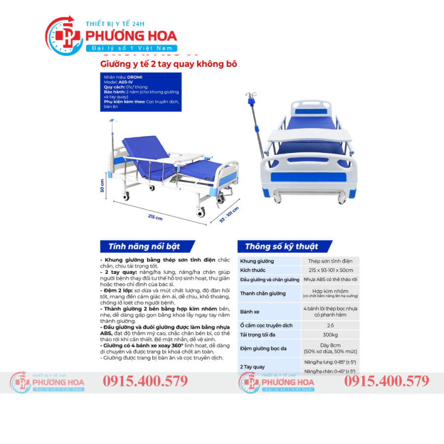 1. Thông số kỹ thuật giường Y Tế 2 Tay Quay Không Bô Oromi ZL-SYB2-I