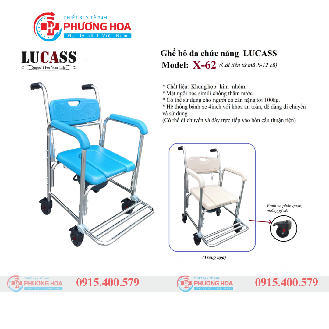 Lucass X-62 là mẫu ghế bô vệ sinh cao cấp được thiết kế dành riêng cho người lớn tuổi, người khuyết tật hoặc bệnh nhân cần hỗ trợ đặc biệt khi đi vệ sinh. Sản phẩm không chỉ thay thế bồn cầu truyền thống mà còn có thể sử dụng như một xe lăn cơ bản với bánh xe chắc chắn, đảm bảo an toàn – linh hoạt – tiện nghi tối đa cho người dùng và người chăm sóc.