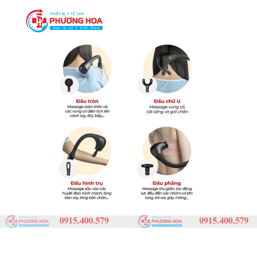 4 đầu massage thay đổi linh hoạt: Phù hợp với từng vùng cơ khác nhau như cổ, vai, bắp tay, đùi, bắp chân...